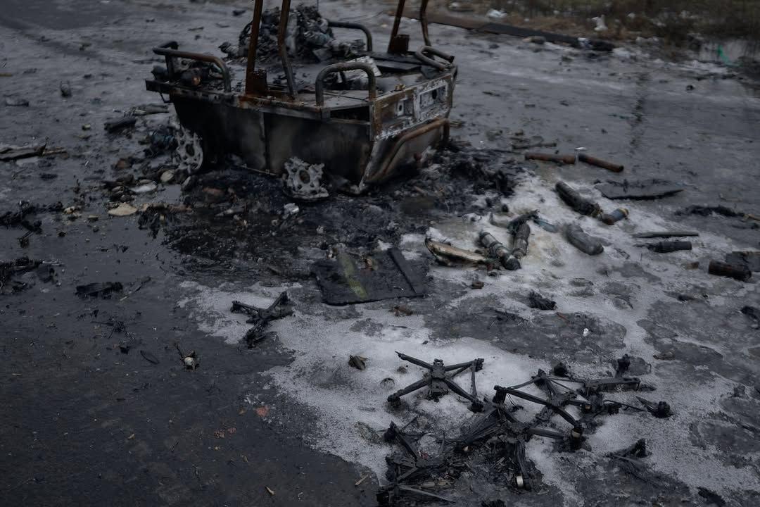 13:19 Так сейчас выглядит дорога с Константиновки на Дружковку. Видны разбитые автомобили, наземные дроны и военная техника.