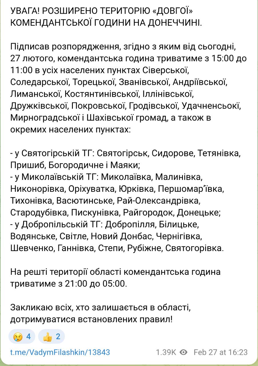 17:44 В Донецкой области существенно расширили перечень районов, где действует почти круглосуточный комендантский час (с 15 до 11), сообщает ОВА.