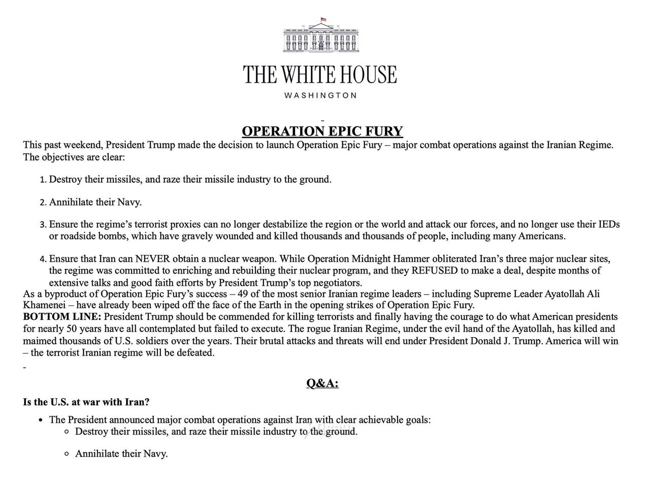 В пресс-релизе Белого дома говорится, что в минувшие выходные президент Трамп принял решение начать операцию "Эпическая ярость" — "масштабную боевую операцию против иранского режима".