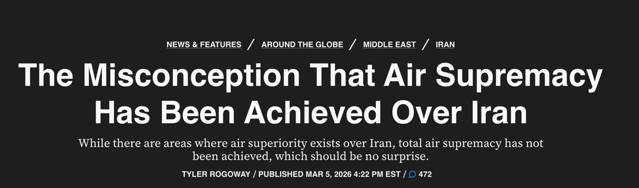 10:13 Журнал The War Zone отрицает распространенное мнение, по которому США и Израилю удалось добиться полного превосходства в воздухе над Ираном. По его оценке, превосходство было достигнуто только в отдельных районах, но полной свободы действий у авиации США и Израиля нет.