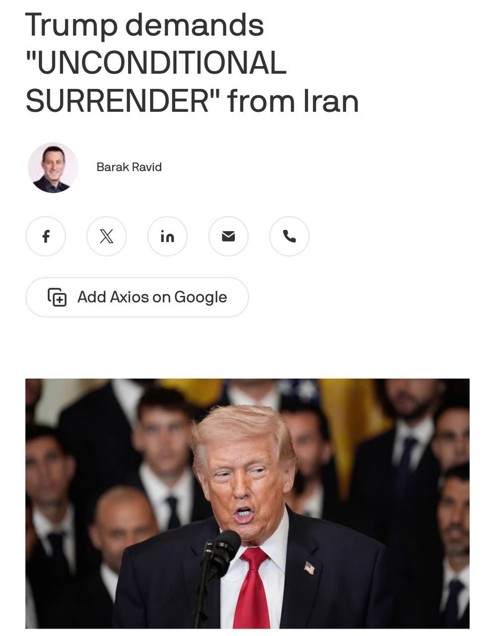22:26 Трамп скорректировал свое заявление о "безоговорочной капитуляции" Ирана - "она может быть неофициальной", сообщает Аxios.