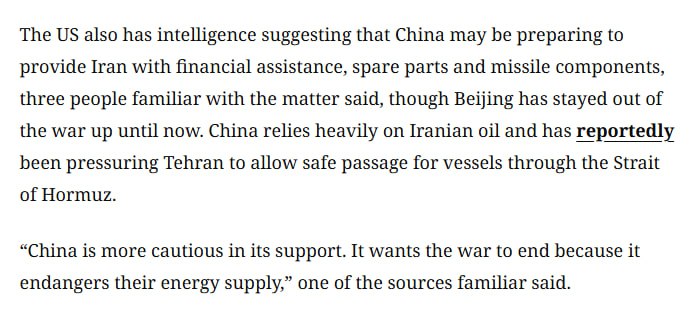 18:44 США располагают разведданными, указывающими на то, что Китай может предоставить Ирану финансовую помощь, запасные части и компоненты для ракет, сообщает CNN.