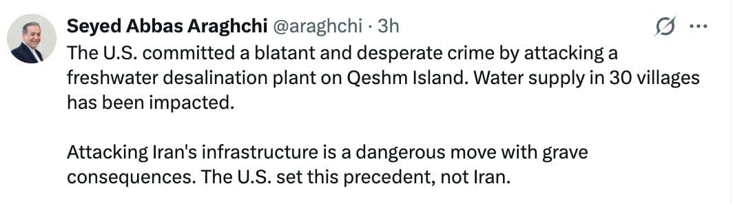 19:28 США нанесли удар по установке по опреснению воды на острове Кешм, из-за чего десятки населенных пунктов остались без пресной воды.