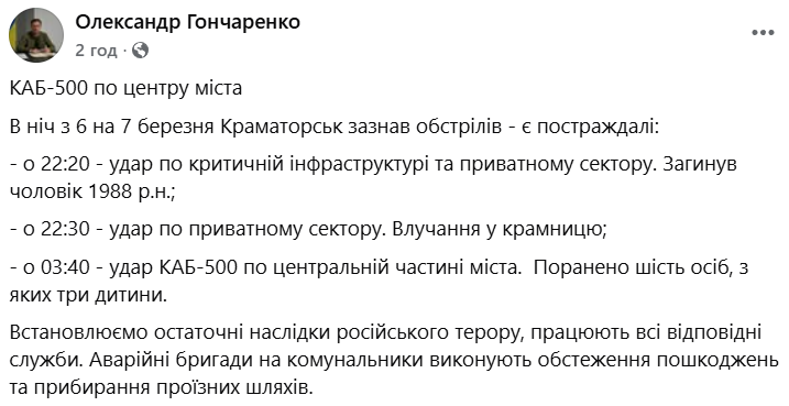 Еще один обстрел произошел 7 марта - около 03:40. Российские войска нанесли удар по центральной части Краматорска авиабомбой КАБ-500.
