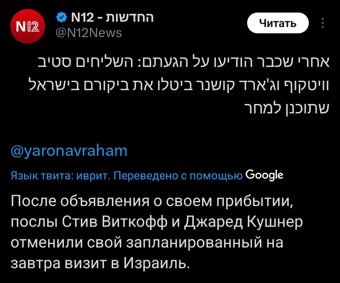 11.16 Спецпосланник президента США Уиткофф и зять Трампа Джаред Кушнер отменили визит в Израиль, запланированный на завтра, передает 12-й канал израильского телевидения.