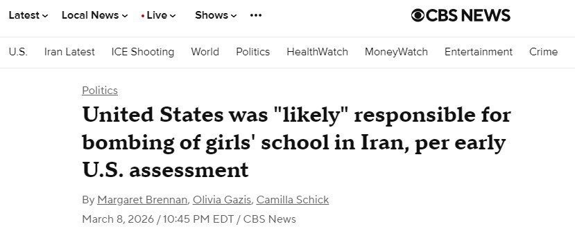 9.18 США могут нести ответственность за удар по школе для девочек в Иране 28 февраля, но при этом атака не была преднамеренной, сообщает CBS News со ссылкой на источники.