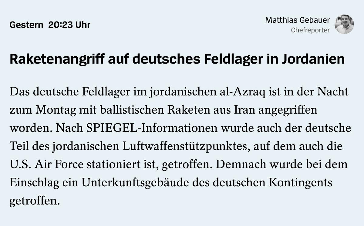 10.18 Иран сегодня ночью нанес ракетный удар по немецкому военному лагерю в Иордании, сообщает Der Spiegel.