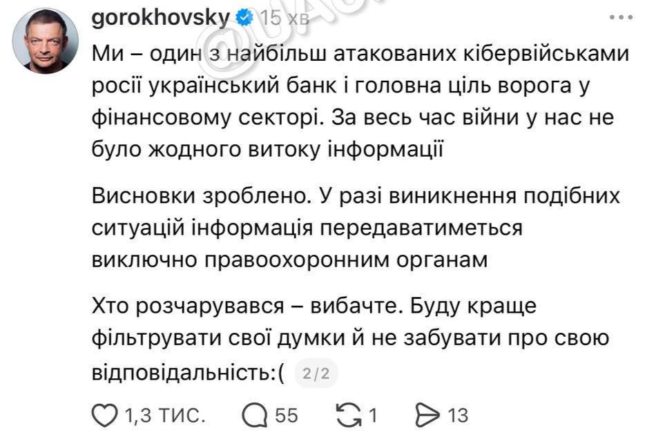После критики за публикацию личных данных девушки-клиента сооснователь Монобанка Олег Гороховский пообещал отныне отправлять подобную информацию сразу правоохранительным органам.