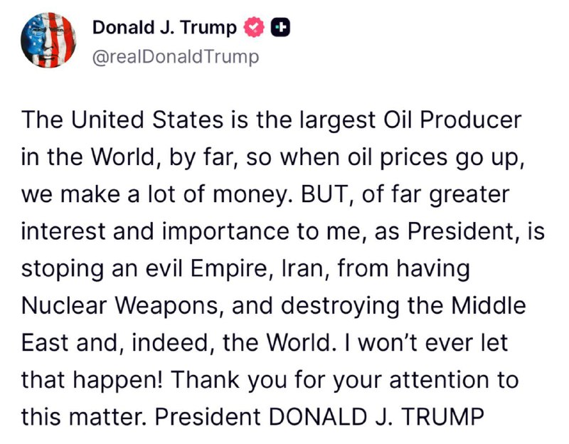 "Соединённые Штаты - крупнейший производитель нефти в мире и с большим отрывом. Поэтому когда цены на нефть растут, мы зарабатываем много денег. Но для меня как для президента гораздо важнее и значимее не допустить, чтобы злая империя, Иран, получила ядерное оружие и уничтожила Ближний Восток и по сути весь мир. Я никогда этого не допущу!" - написал президент США в соцсетях.