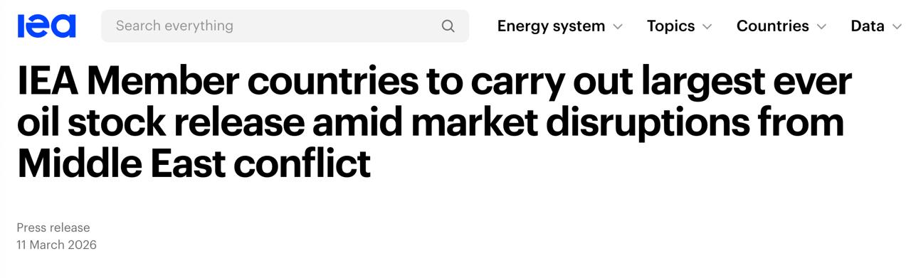 Страны Международного энергетического агентства (МЭА) договорились выставить на рынок 400 миллионов баррелей нефти из своих чрезвычайных резервов, чтобы компенсировать потери из-за войны на Ближнем Востоке.