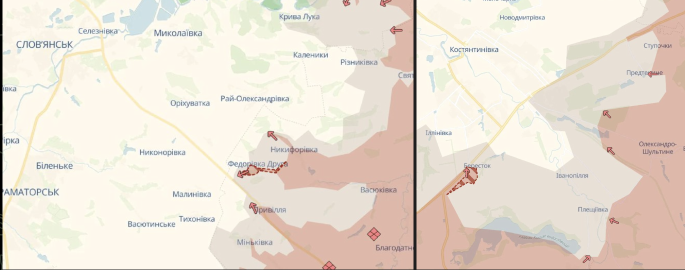 На Константиновском направлении россияне постоянно прощупывают оборону вокруг города, ищут слабые места, чтобы выйти к Константиновке. В районе Славянска увеличивается количество штурмовых действий, прежде всего благодаря успехам РФ в захвате Северска, сообщает Deep State.
