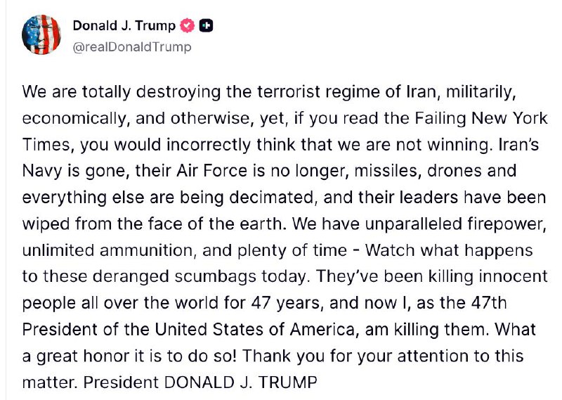 "Если вы читаете терпящую крах The New York Times, вы могли бы ошибочно подумать, что мы не побеждаем. Военно-морские силы Ирана уничтожены, их военно-воздушных сил больше не существует, ракеты, дроны и всё остальное подвергаются тотальному уничтожению, а их лидеры стерты с лица земли", - написал президент США.