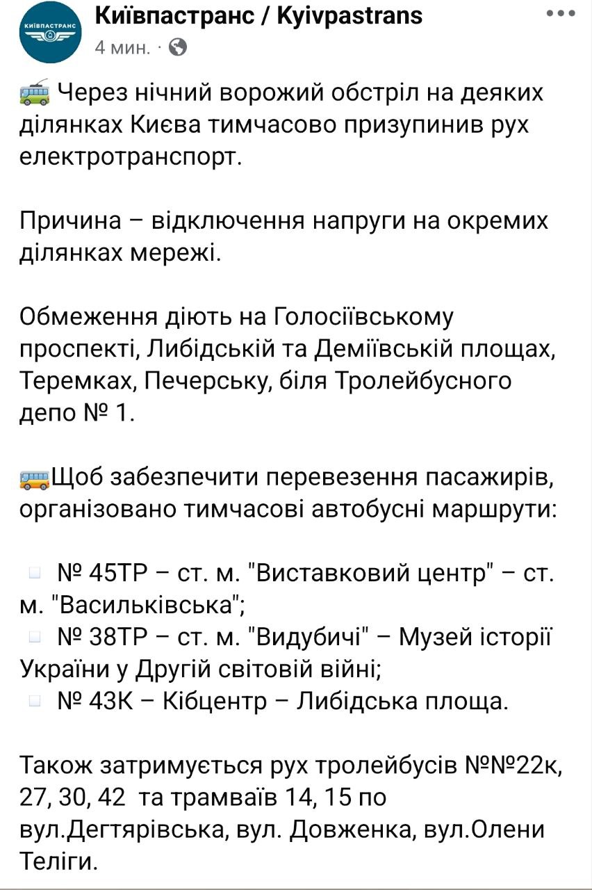 Городские службы сообщили, что Киеве из-за ночного обстрела остановили движение электротранспорта на отдельных участках. Причиной является отключение напряжения на части контактной сети.