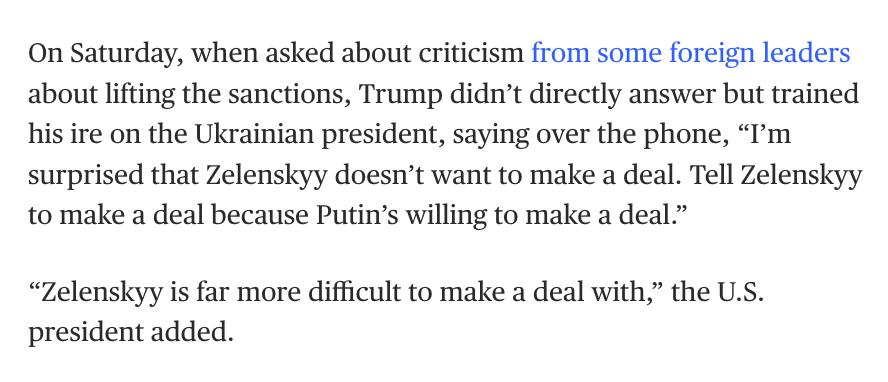 "Я удивлён, что Зеленский не хочет заключить сделку. Скажите Зеленскому, чтобы он заключил сделку, потому что Путин готов заключить сделку. С Зеленским намного труднее заключить сделку", - сказал президент США.