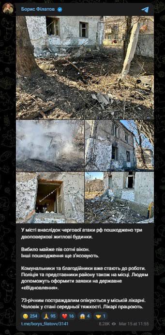 13:55 По Днепру был нанесен удар, сообщает мэр Днепра Филатов. По его словам, повреждены три двухэтажных дома. Из-за удара был ранен 73 летний мужчина, его госпитализировали.