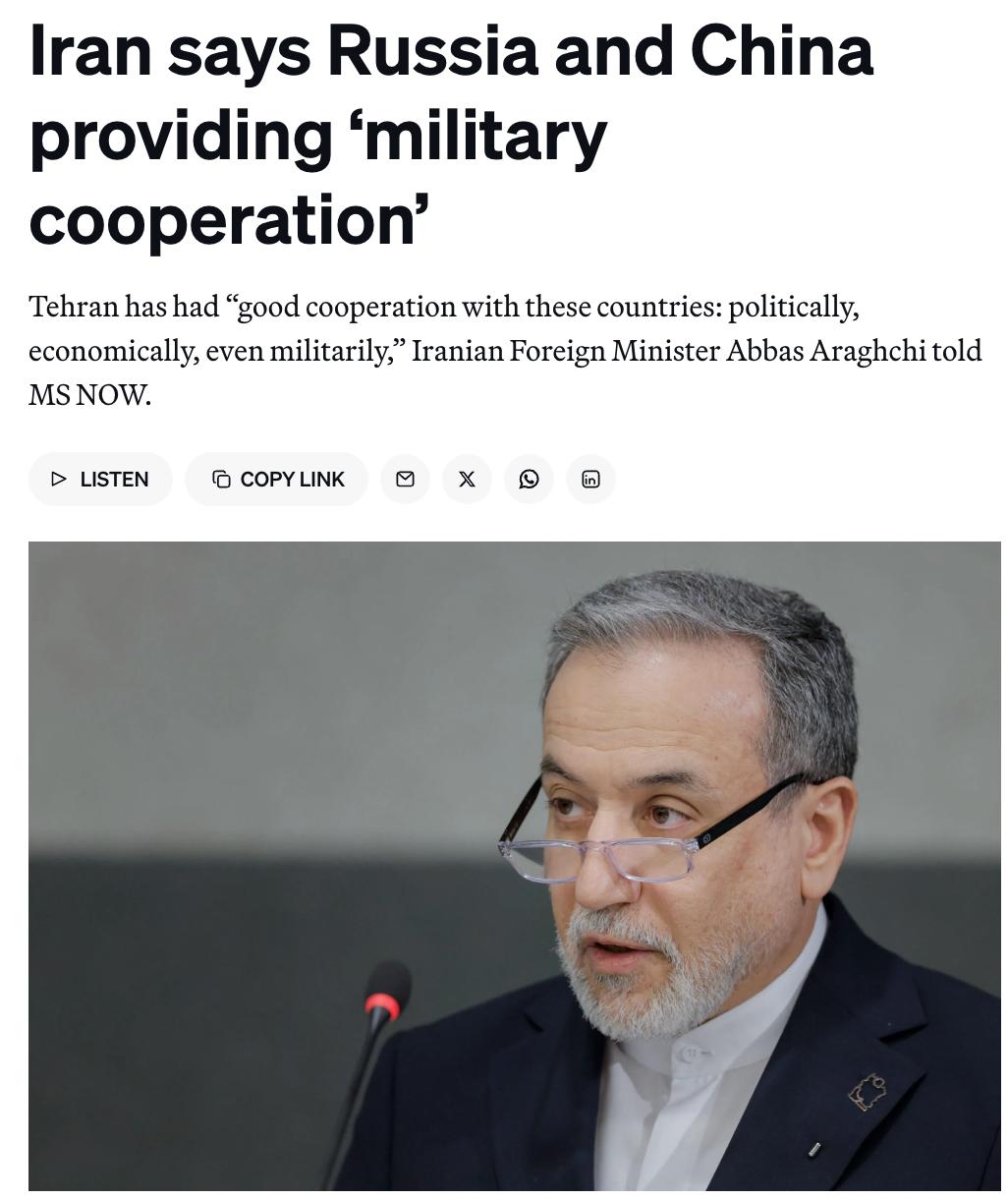 По словам Аракчи, Тегеран считает Москву и Пекин стратегическими партнерами и продолжает взаимодействие с ними, в том числе в военной сфере.