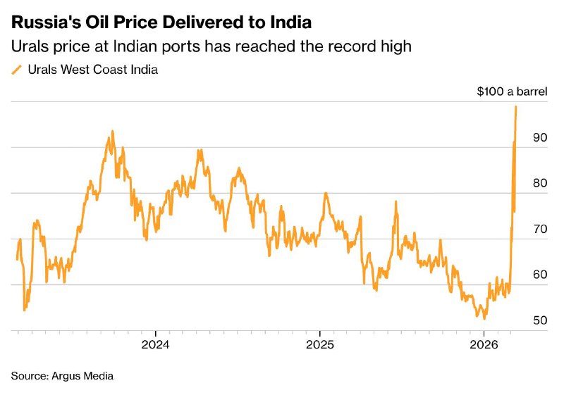 В пятницу цена нефти Urals на западном побережье Индии достигла 98,93 доллара за баррель. Эта цена, включающая стоимость доставки, стала самой высокой с момента, когда Россия перенаправила экспорт нефти в Индию после вторжения в Украину в начале 2022 года.