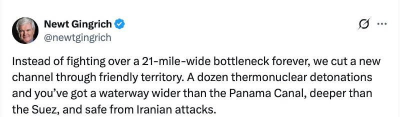 "Вместо того чтобы вечно сражаться за 21-мильный узкий проход, мы пророем новый канал через дружественную территорию. Дюжина термоядерных взрывов - и у вас будет водный путь шире Панамского канала, глубже Суэцкого и безопасный от атак Ирана", - написал Гингрич в Х.