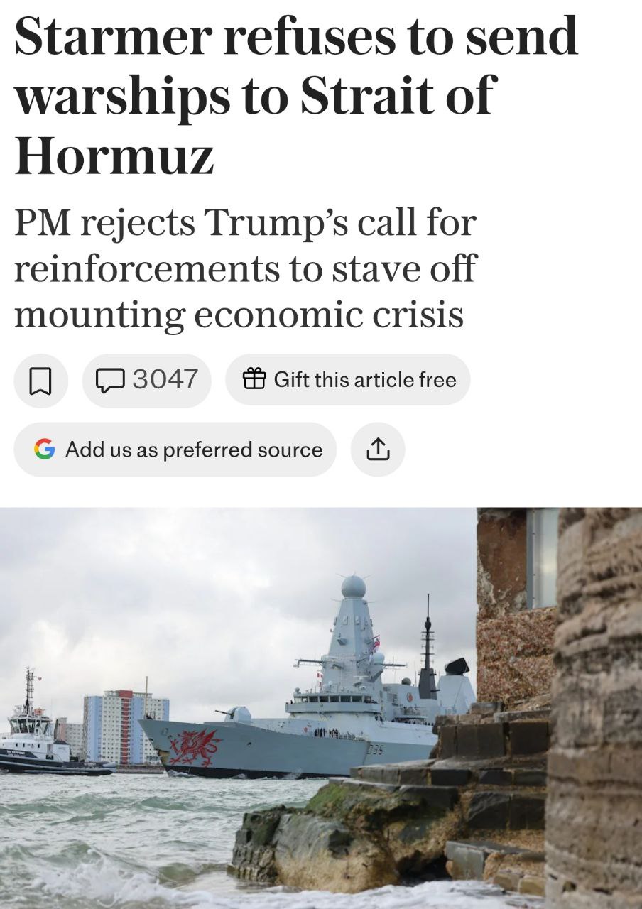 Американский президент заявил, что Франция, скорее всего, поможет США с разблокировкой Ормузского пролива, в то время как Великобритания – нет. Он выразил удивление отказом Лондона – древнейшего союзника США, в то время как Вашингтон сотрудничает с ним по помощи Украине.