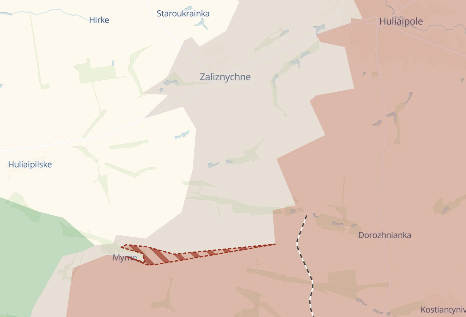 Южнее дороги Гуляйполе – Орехов российские подразделения продвинулись в направлении Железнодорожное – Гуляйпольское примерно на 4,5 километра. Кроме того, фиксируются небольшие вклинения российских штурмовых групп севернее Загорного и восточнее Мирного, а также продвижение в сторону Святопетровки, куда отдельные группы уже смогли зайти.