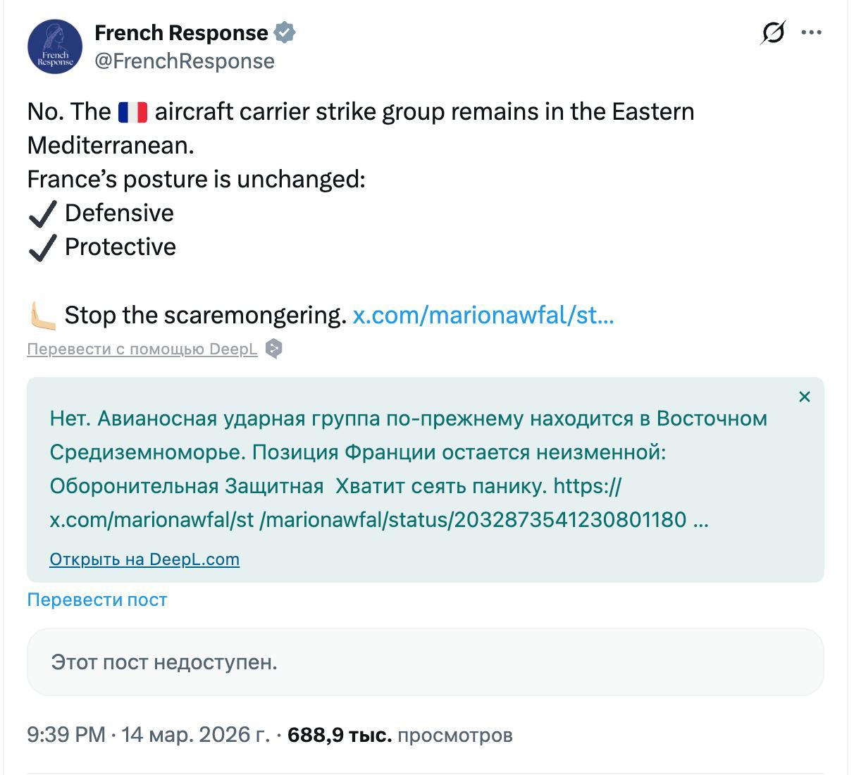 "Нет. Авианосная ударная группа по-прежнему находится в Восточном Средиземноморье. Позиция Франции остается неизменной: оборонительная, защитная. Хватит сеять панику", - написал Х-аккаунт МИД Франции, комментируя сообщение об отправке войск в Ормуз.
