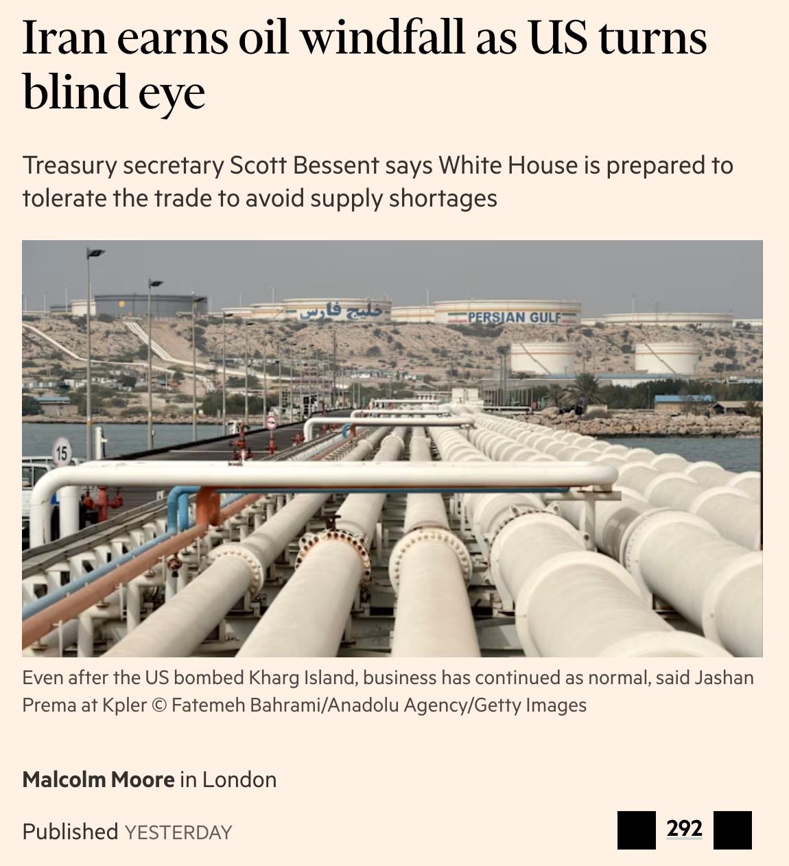 Судя по косвенным признакам, ежедневная выручка Ирана от продажи нефти составляет более 140 миллионов долларов, поскольку цены растут. При этом США никак не борются с поставками Тегерана, чтобы не дестабилизировать ещё больше и без того страдающий из-за войны рынок сырой нефти.