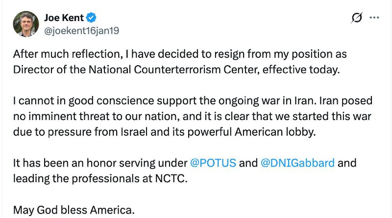 В США глава центра по борьбе с терроризмом в аппарате директора национальной разведки США Джо Кент заявил, что уходит в отставку. Причиной своего решения он назвал несогласие с военной операцией США и Израиля против Ирана.