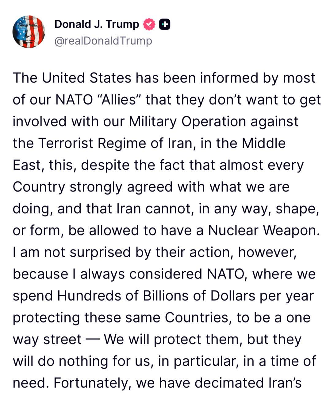 "Большинство наших "союзников" по НАТО проинформировали Соединенные Штаты о том, что они не хотят участвовать в нашей военной операции против террористического режима Ирана на Ближнем Востоке, несмотря на то, что почти все страны решительно согласились с тем, что мы делаем, и что Иран не может, каким бы то ни было образом, в какой бы то ни было форме, ему не было позволено обладать ядерным оружием.