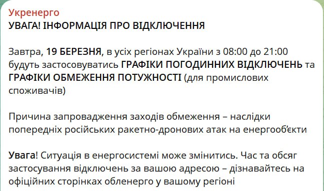 18.42 Завтра отключения света будут по всей стране с 8.00 до 21.00 по графикам, сообщает "Укрэнерго".