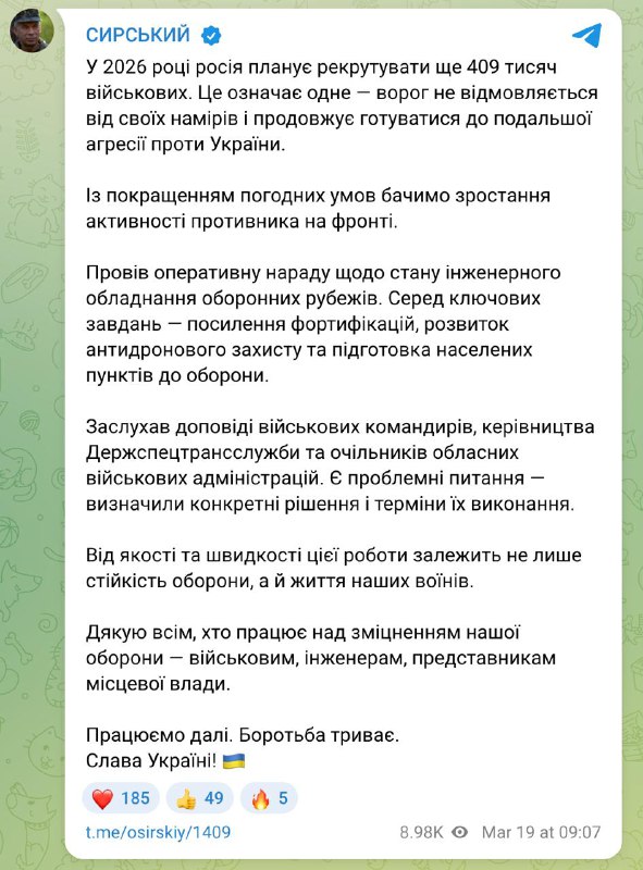 10:47 В этом году Россия планирует призвать ещё 409 тысяч военнослужащих, заявил главком ВСУ Сырский. 409 тысяч на 9,5 оставшихся месяцев 2026 года - это примерно по 43 тысячи мобилизованных в месяц.