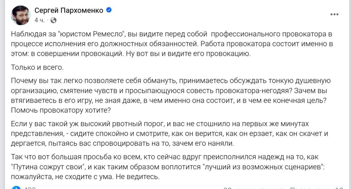 "Почему вы так легко позволяете себя обмануть, принимаетесь обсуждать тонкую душевную организацию, смятение чувств и просыпающуюся совесть провокатора-негодяя? Зачем вы втягиваетесь в его игру, не зная даже, в чем именно она состоит и в чем ее конечная цель? Помочь провокатору хотите? Так что вот большая просьба ко всем, кто сейчас вдруг преисполнился надежд на то, как "Путина сожрут свои" и как таким образом воплотится "лучший из возможных сценариев": пожалуйста, не сходите с ума. Не ведитесь", - написал Пархоменко.