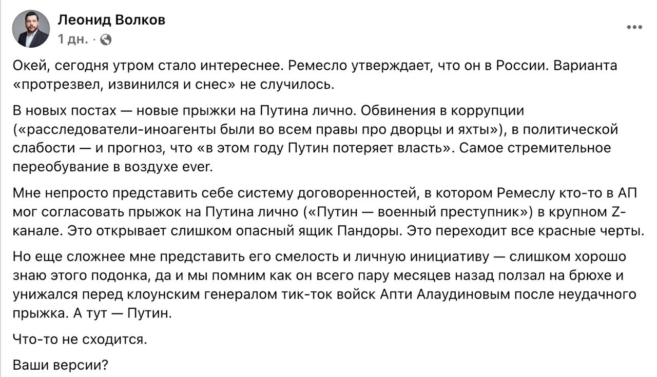 "Мне непросто представить себе систему договоренностей, в котором Ремесло кто-то в Администрации президента мог согласовать прыжок на Путина лично ("Путин - военный преступник") в крупном Z-канале. Это открывает слишком опасный ящик Пандоры. Это переходит все красные черты. Но еще сложнее мне представить его смелость и личную инициативу - слишком хорошо знаю этого подонка, да и мы помним, как он всего пару месяцев назад ползал на брюхе и унижался перед клоунским генералом ТикТок-войск Апти Алаудиновым после неудачного прыжка. А тут - Путин", - высказался Волков.