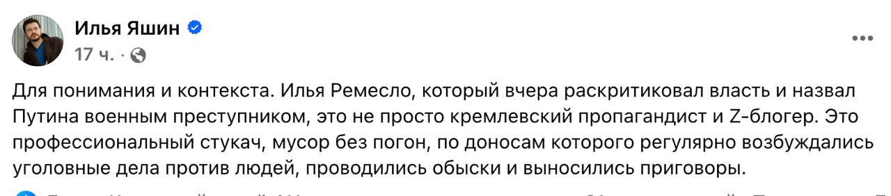 Оппозиционный политик Илья Яшин заявил, что Ремесло - это "не просто кремлевский пропагандист и Z-блогер", а "профессиональный стукач, мусор без погон", по чьим доносам "регулярно возбуждались уголовные дела против людей".