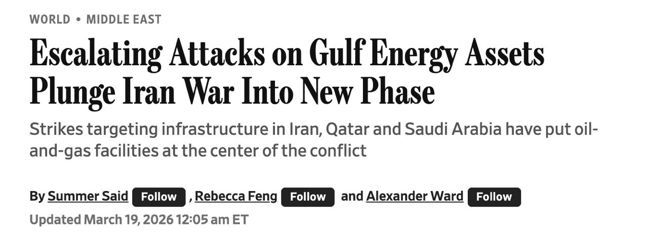 Эксперты же отмечают, что атаки на объекты энергетики Ирана и удары Ирана по энергообьектам в странах Персидского залива создадут "новый уровень энергетического воздействия от этой войны, выходящий за рамки закрытия Ормузского пролива, поскольку время на восстановление повреждённых объектов может превысить продолжительность войны".