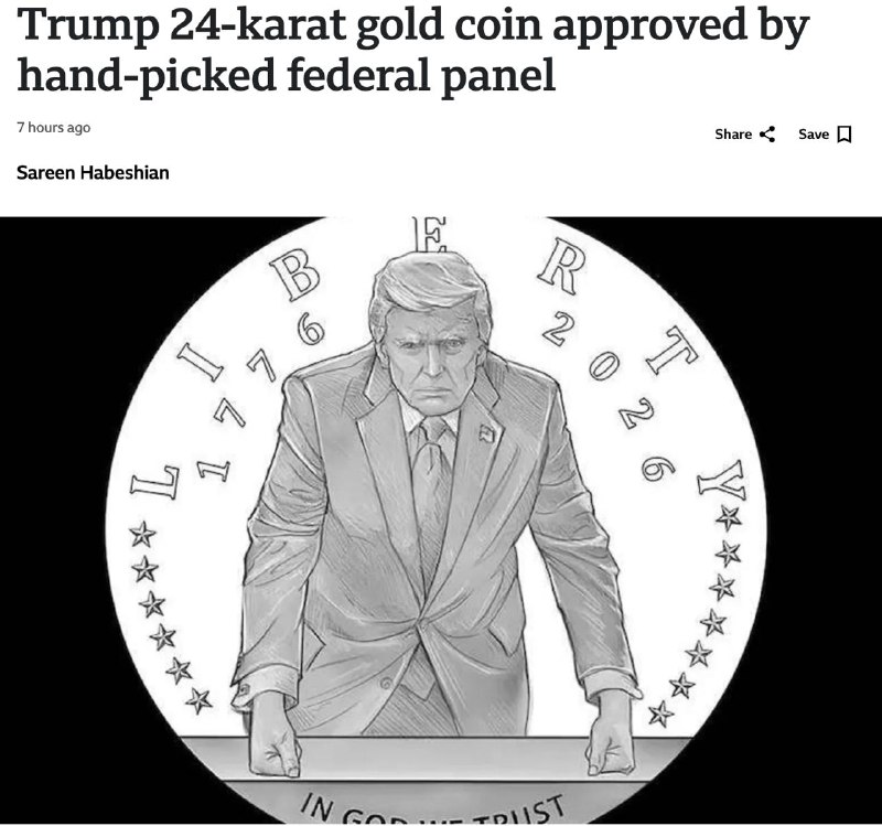 Федеральная комиссия по делам искусств, назначенная Дональдом Трампом, единогласно одобрила выпуск памятной золотой монеты с изображением действующего президента США. Монета из 24-каратного золота войдет в серию, подготовленную к 250-летию независимости США. Она будет коллекционной и не войдет в обращение.