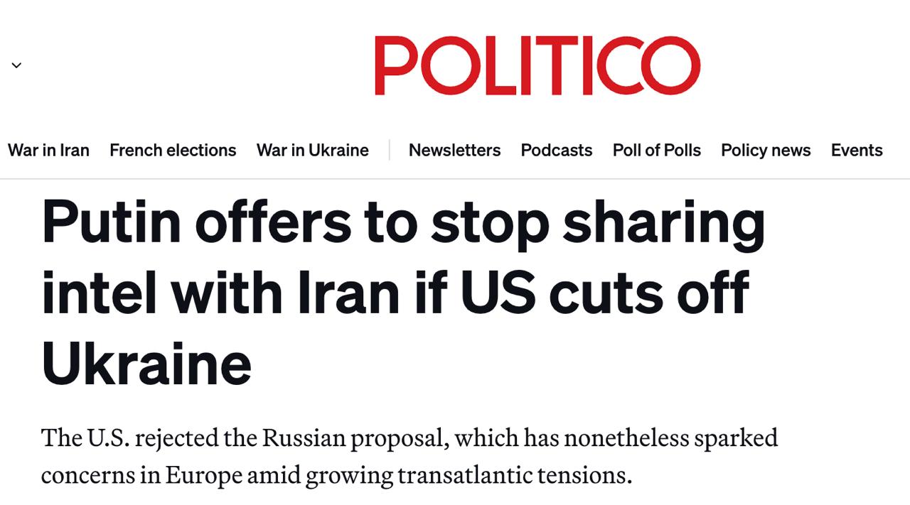 При этом сам Дмитриев назвал "фейком" публикацию Politico, в которой говорилось, что Россия предлагала США прекратить передачу разведданных Ирану в обмен на отказ от поддержки Украины.