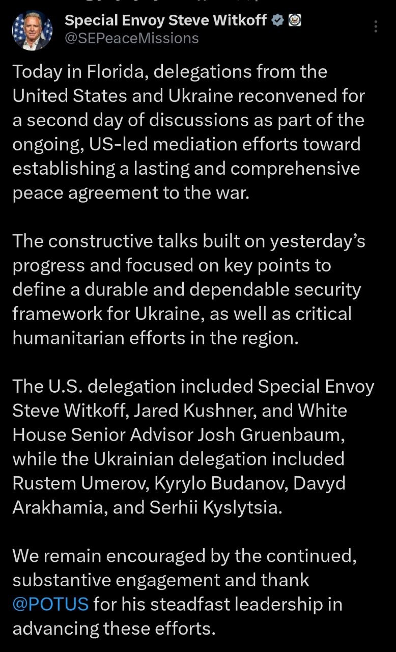 Также и спецпредставитель президента США Стивен Уиткофф заявил о прогрессе на переговорах по Украине.