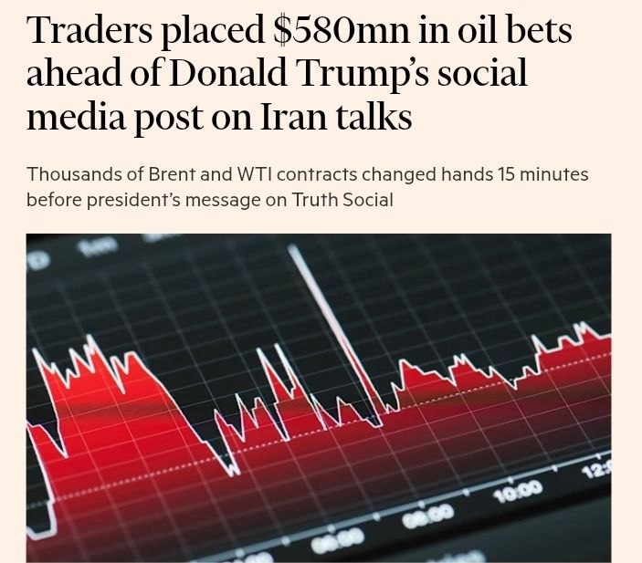 Трейдеры за 15 минут до заявления президента США Дональда Трампа о "продуктивных переговорах" с Ираном распродали нефтяных фьючерсов почти на 580 миллионов долларов - ещё до падения цены, которое было вызвано постом американского лидера.