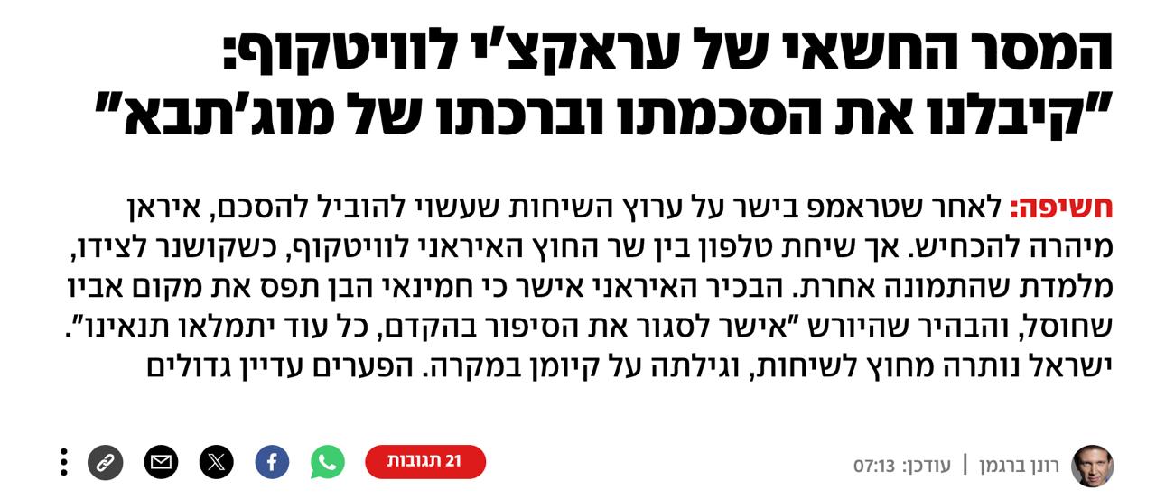 Согласие аятоллы глава МИД Ирана Аббас Аракчи озвучил по телефону спецпосланнику президента США Стивену Уиткоффу в присутствии зятя американского лидера Джареда Кушнера, чтобы указать, кто является средоточием власти в Иране. А Вашингтон таким образом по сути признал Моджтабу Хаменеи лидером, пишет издание.