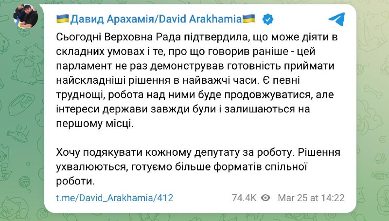 "Сегодня Верховная Рада подтвердила, что может действовать в сложных условиях, и то, о чем говорил раньше: этот парламент не раз демонстрировал готовность принимать самые сложные решения в самые тяжелые времена. Есть некоторые трудности, работа над ними будет продолжаться, но интересы государства всегда были и остаются на первом месте. Хочу поблагодарить каждого депутата за работу. Решения принимаются, готовим больше форматов совместной работы", - написал Арахамия.