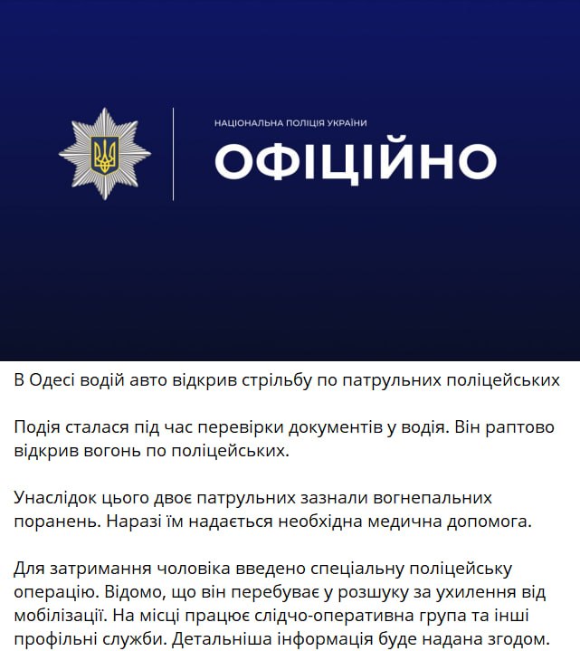 Позже Национальная полиция подтвердила факт стрельбы по полицейским в Одессе и информацию о двух раненых правоохранителях. Сообщается, что водитель начал стрелять во время проверки документов.