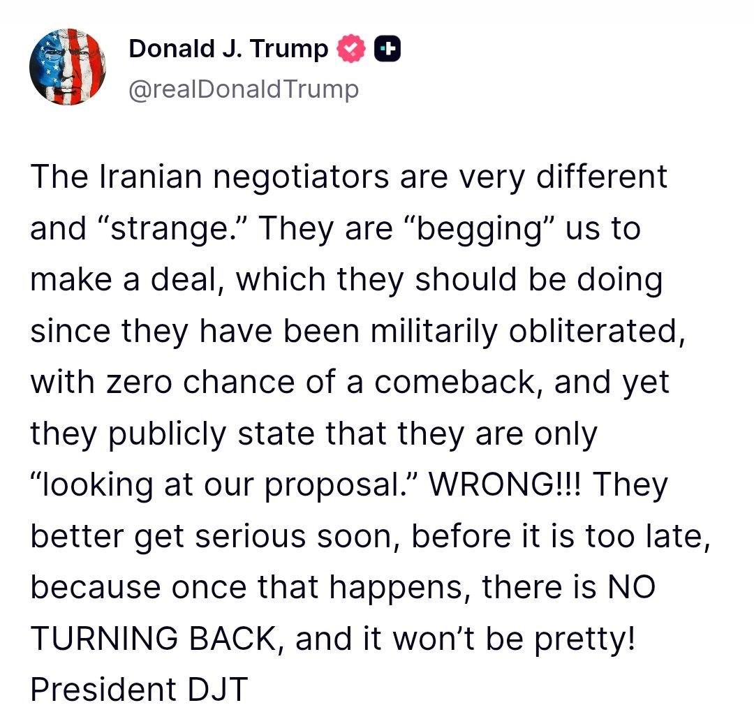"Они "умоляют" нас заключить сделку, что им и следует делать, поскольку их уже полностью разгромили в военном отношении, и у них нет ни единого шанса на возвращение. При этом публично они заявляют, что лишь "изучают наше предложение". Неправда!!! Им лучше поскорее начать относиться к этому серьёзно, пока не стало слишком поздно, потому что, когда это произойдёт, пути назад уже не будет, и всё будет совсем некрасиво!" - написал президент США в своей соцсети.