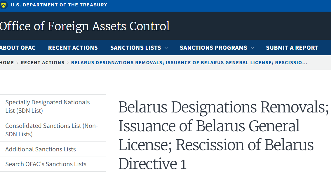 США объявили об отмене санкций против министерства финансов Беларуси, Белинвестбанка, Банка развития республики, а также компании "Беларуськалий".