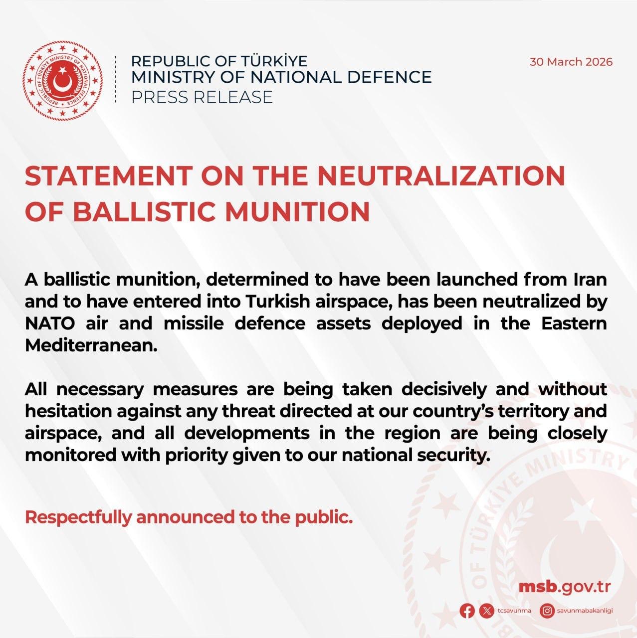 "Баллистический боеприпас, установленный как запущенный с территории Ирана и вошедший в воздушное пространство Турции, был нейтрализован средствами противовоздушной и противоракетной обороны НАТО, развёрнутыми в Восточном Средиземноморье", - говорится в публикаци.