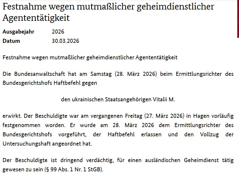 В заявлении говорится, что Виталий М. по поручению российской спецслужбы по крайней мере с ноября 2025 года собирал информацию о проживающем в Германии мужчине, который после начала войны принимал участие в боевых действиях на стороне ВСУ.