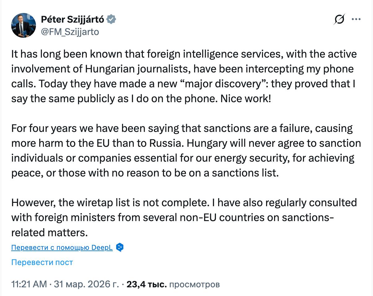 "Уже давно известно, что иностранные спецслужбы при активном участии венгерских журналистов прослушивают мои телефонные разговоры. Сегодня они сделали новое "важное открытие": доказали, что я публично говорю то же самое, что и по телефону. Отличная работа! Уже четыре года мы говорим, что санкции - это провал, наносящий больше вреда ЕС, чем России", - написал министр в Х.
