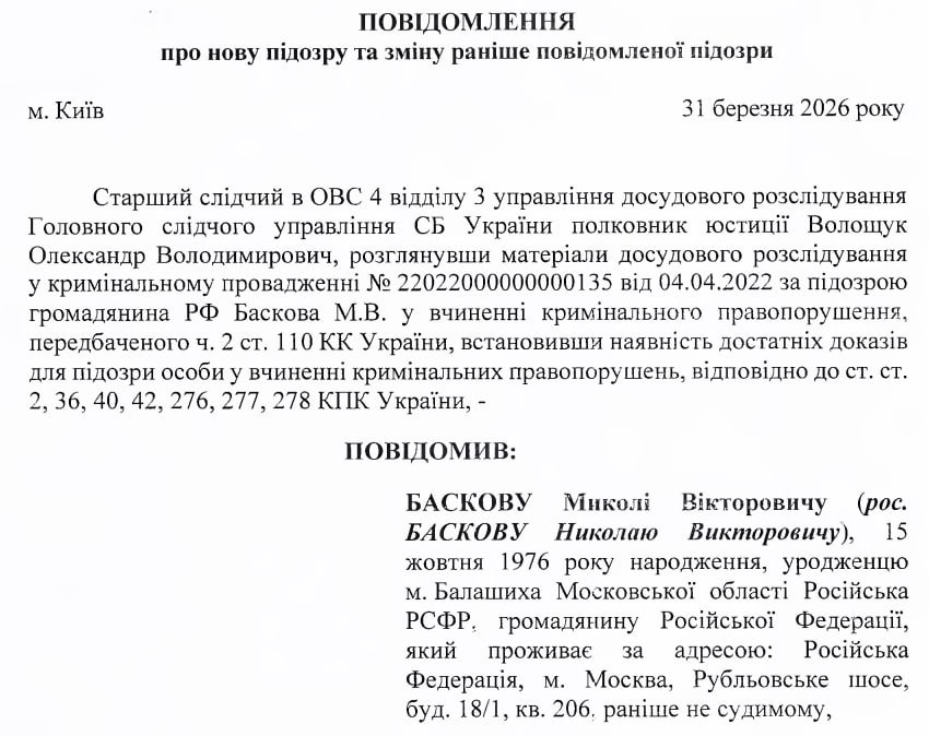 Служба безопасности Украины (СБУ) заочно предъявила новые обвинения российскому певцу, народному артисту РФ Николаю Баскову.