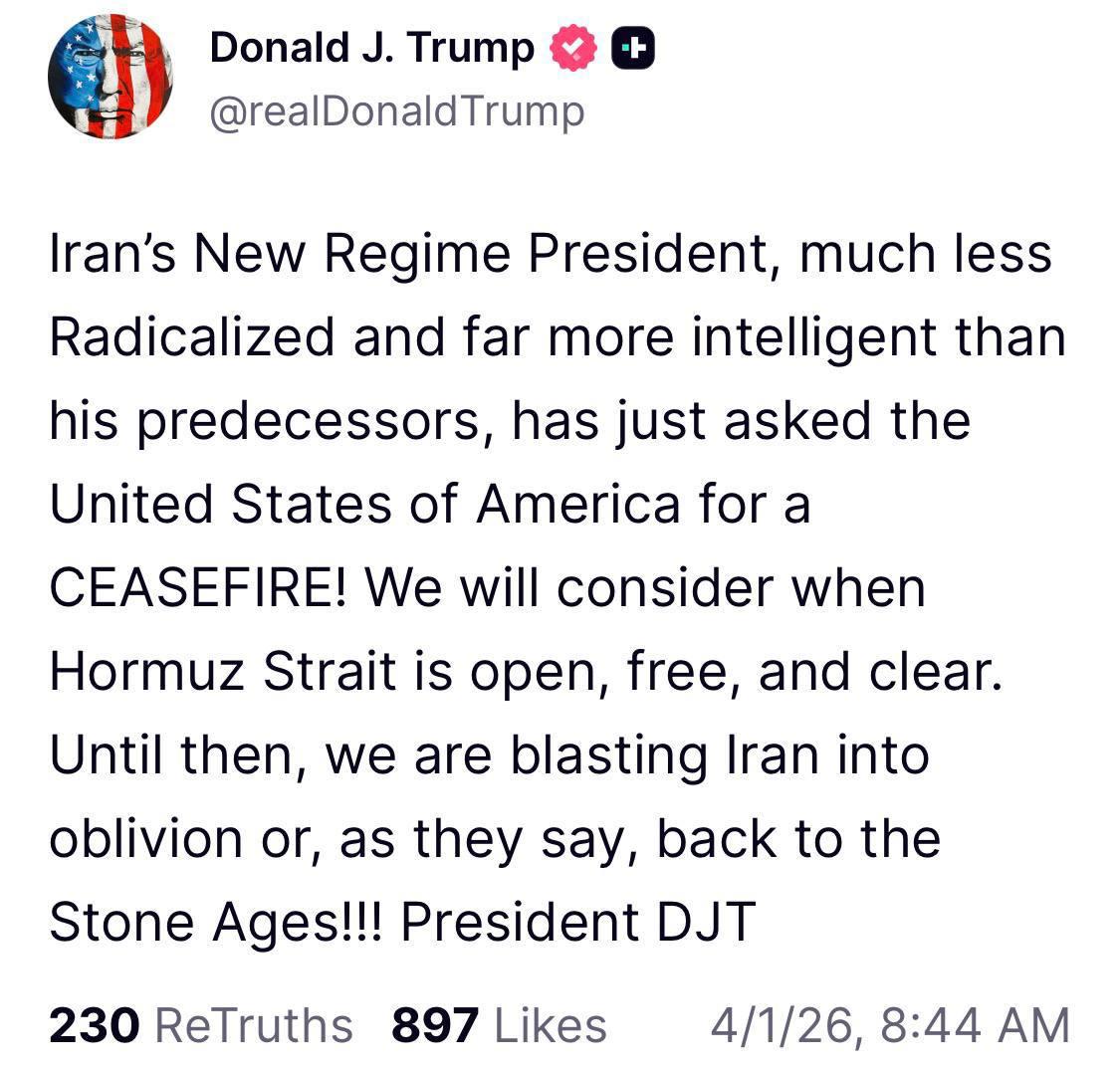 "Президент нового режима Ирана, гораздо менее радикальный и значительно более интеллектуальный, чем его предшественники, только что попросил у Соединенных Штатов Америки прекращение огня! Мы рассмотрим, когда Ормузский пролив будет открыт, свободен и ясен. До тех пор мы уничтожаем Иран или, как говорят, возвращаем его в каменный век!" - написал президент США.