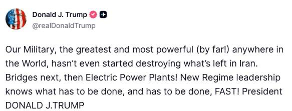 "Наши вооруженные силы - самые великие и могущественные (безусловно!) во всем мире - еще даже не приступили к уничтожению того, что осталось в Иране. Следующие на очереди мосты, а затем электростанции! Руководство нового режима знает, что нужно сделать, и это нужно сделать быстро!" - написал президент США.