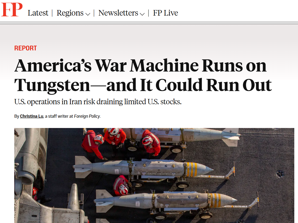 Война против Ирана выявила, насколько сильно американская военная машина зависит от вольфрама, который США не добывают в промышленных масштабах. Этот серебристый металл, известный исключительной плотностью и самой высокой температурой плавления среди всех чистых металлов, очень востребован в американской военной промышленности.